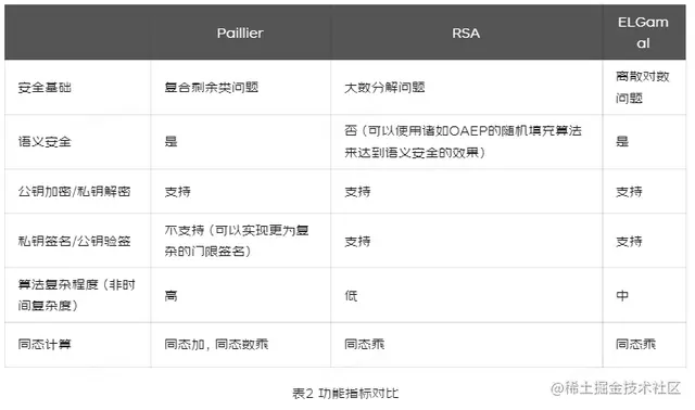 Paillier,RSA和ELGamal算法均为典型的基于公钥的加密算法,我们从功能指标和性能指标两个方向,来对比这些加密算法的区别和联系。