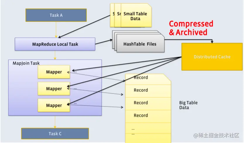 Map Join算法可以通过两个只有map阶段的Job完成一个join操作。其适用场景为大表join小表。若某join操作满足要求,则第一个Job会读取小表数据,将其制作为hash table,并上传至Hadoop分布式缓存(本质上是上传至HDFS)。第二个Job会先从分布式缓存中读取小表数据,并缓存在Map Task的内存中,然后扫描大表数据,这样在map端即可完成关联操作。