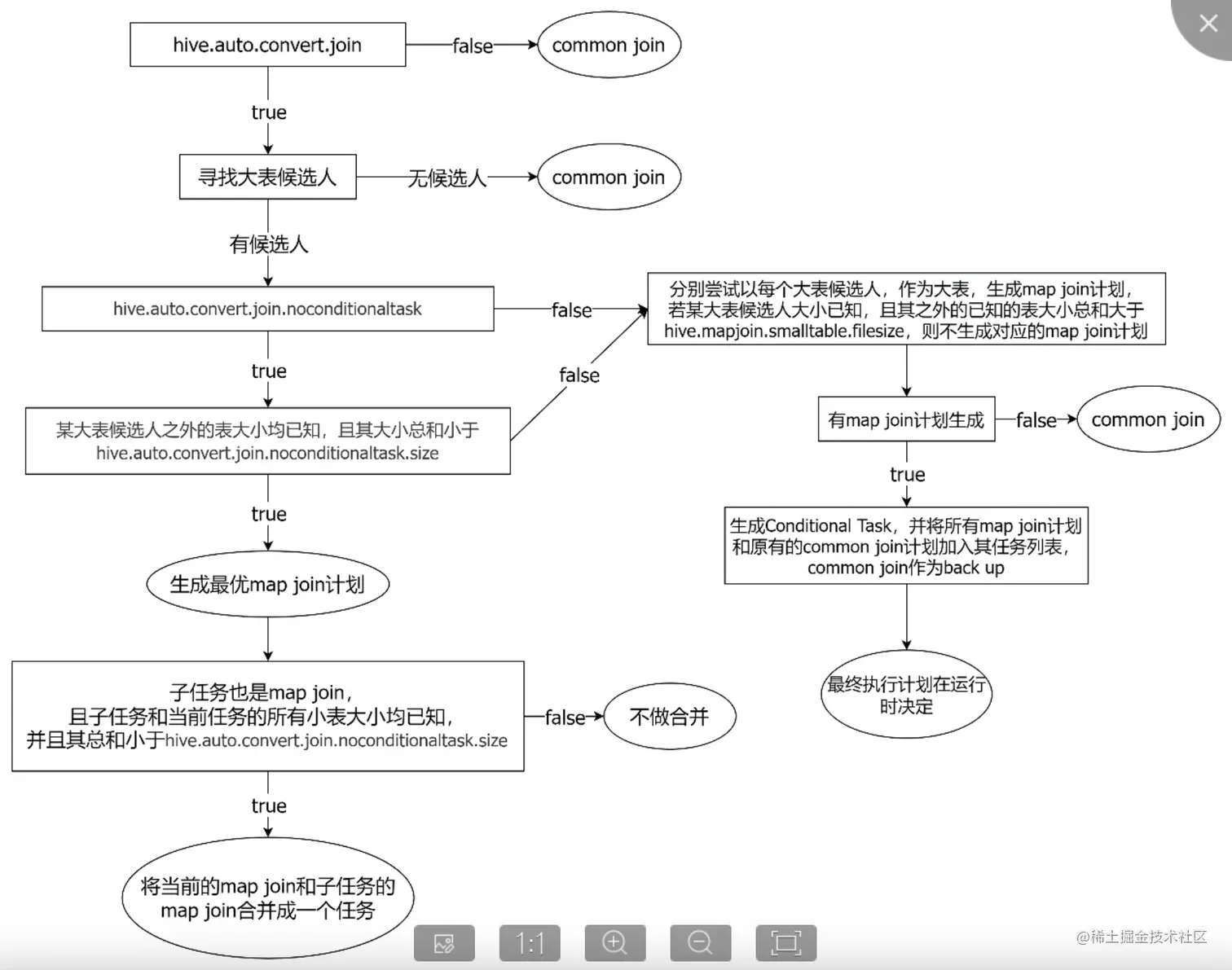 之后在物理优化阶段,Hive会根据每个Common Join任务所需表的大小判断该Common Join任务是否能够转换为Map Join任务,若满足要求,便将Common Join任务自动转换为Map Join任务。