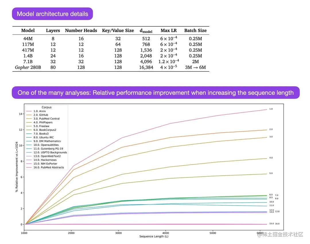 Gopher 是一篇特别好的论文(arxiv.org/abs/2112.11…),包括大量的分析来理解 LLM 训练。研究人员在 3000 亿个 token 上训练了一个 80 层的 2800 亿参数模型。其中包括一些有趣的架构修改,比如使用 RMSNorm (均方根归一化) 而不是 LayerNorm (层归一化)。LayerNorm 和 RMSNorm 都优于 BatchNorm,因为它们不局限于批处理大小,也不需要同步,这在批大小较小的分布式设置中是一个优势。RMSNorm 通常被认为在更深的体系架构中会稳定训练。