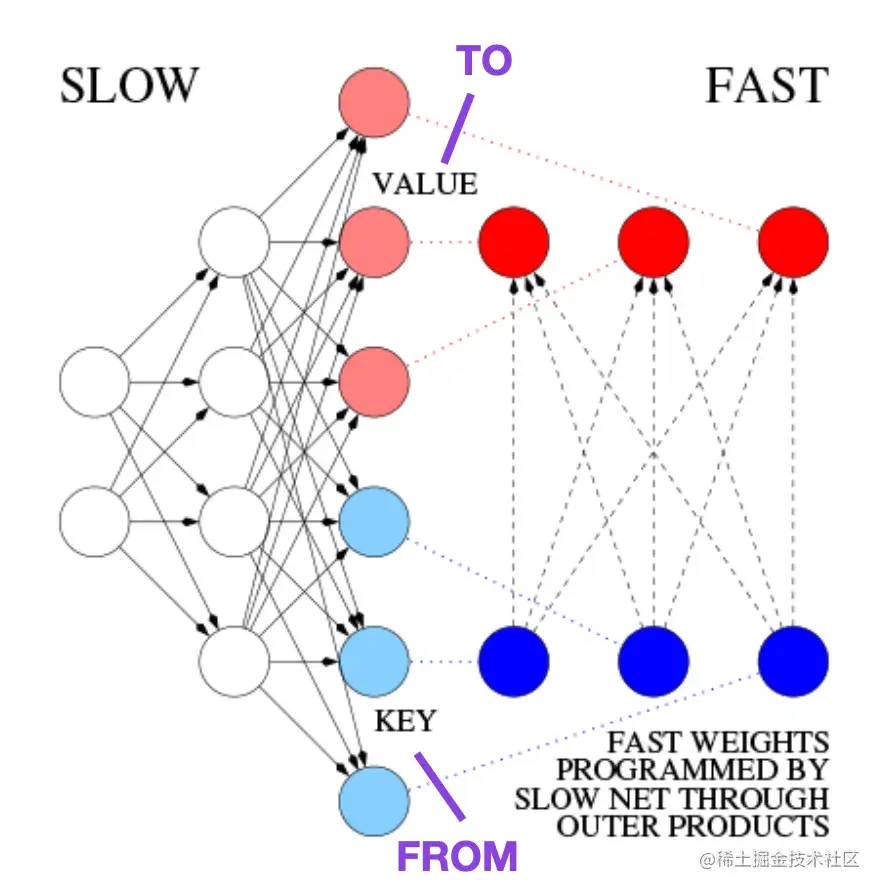 例如,在比 Transformer 论文早 25 年的 1991 年,Juergen Schmidhuber 提出了一种递归神经网络的替代方案(www.semanticscholar.org/paper/Learn…),称为 Fast Weight Programmers (FWP)。FWP 方法涉及一个前馈神经网络,它通过梯度下降缓慢学习,来编程另一个神经网络的快速权值的变化。