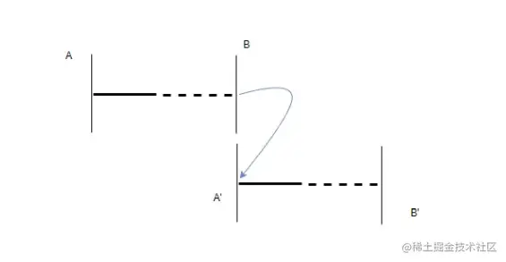 文字有点抽象,我们结合示意图来分析,我们用实线代表虚线中的线,用虚线代表虚线中的空白,当线段从A偏移到B时,我们让动画 Restart,这样又会从A'偏移到B',如此不断Restart,实现无限转动效果。