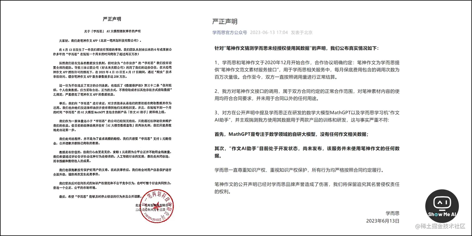 6月13日,笔神作文在官方微博发布「关于〖学而思〗AI大模型侵权事件的声明」。声明称4月13日至17日,学而思通过「爬虫」技术非法访问、缓存笔神作文App服务器数据多达258万次,用于其AI大模型 MathGPT 的训练,这一行为严重侵犯了笔神作文数据权益。