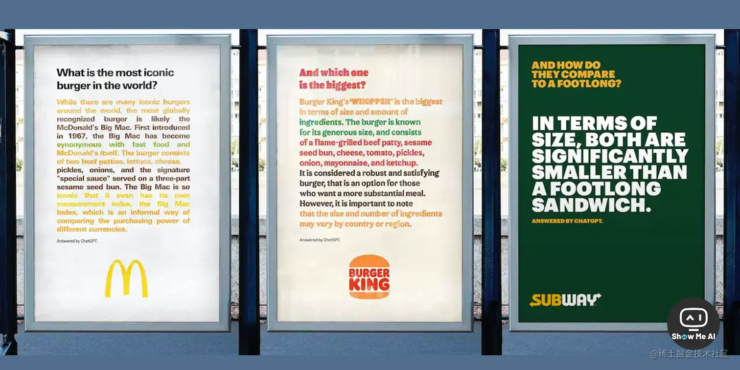 汉堡王表示不服,向 ChatGPT 提问「谁是世界上最大的汉堡?」答案正中下怀「汉堡王的皇堡」。于是汉堡王也做了张海报,还特意投放在麦当劳的海报旁边。