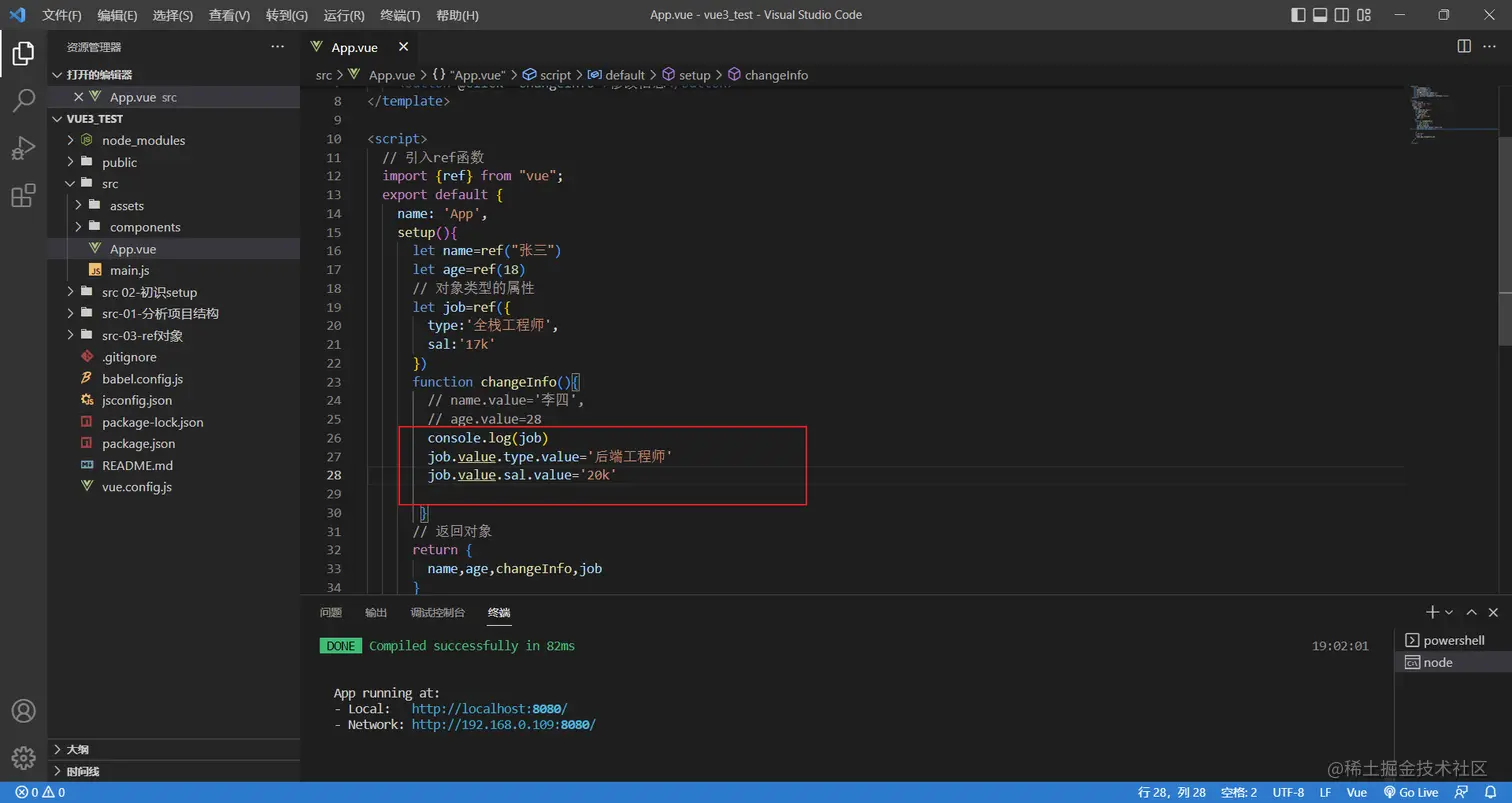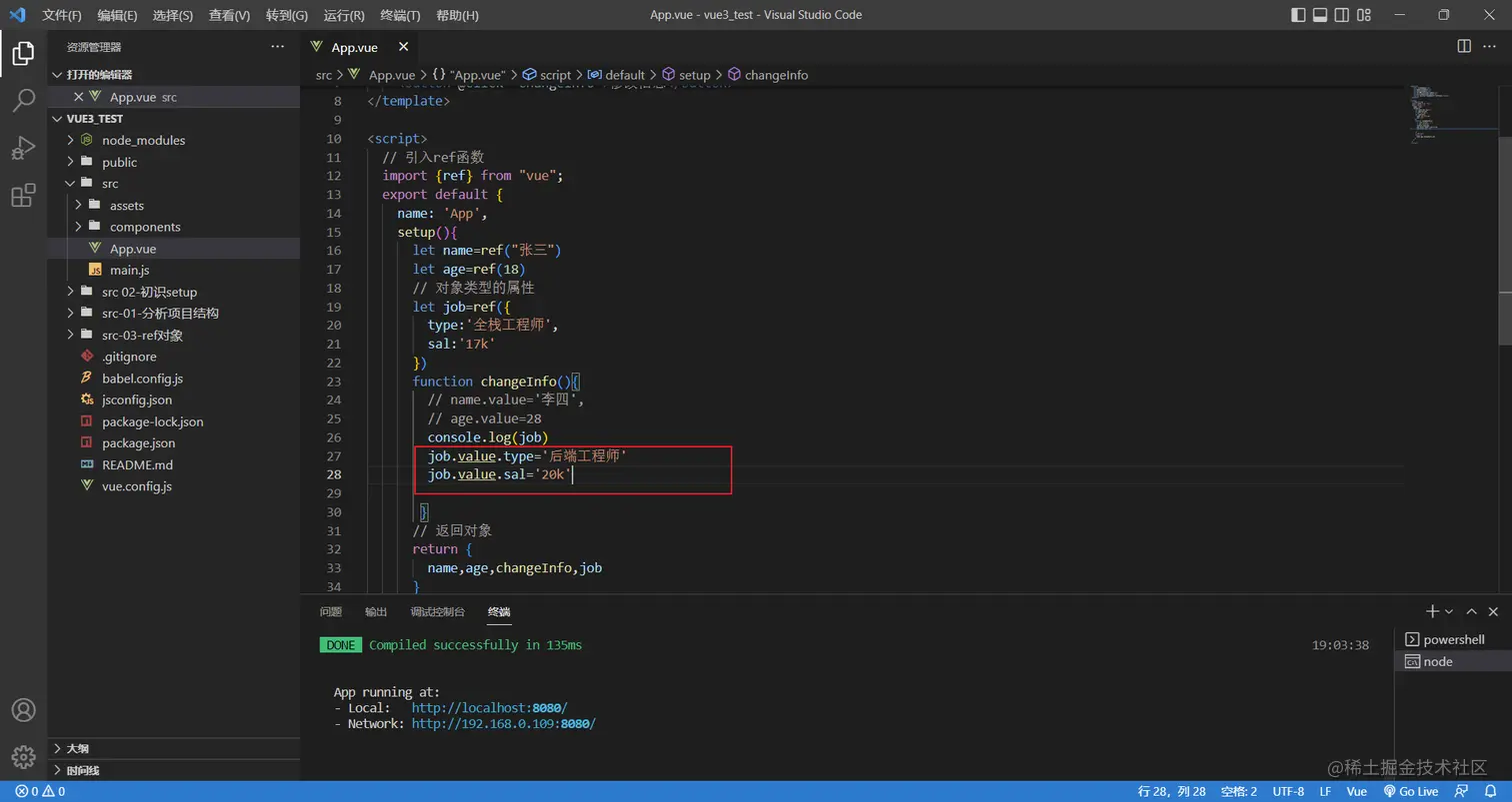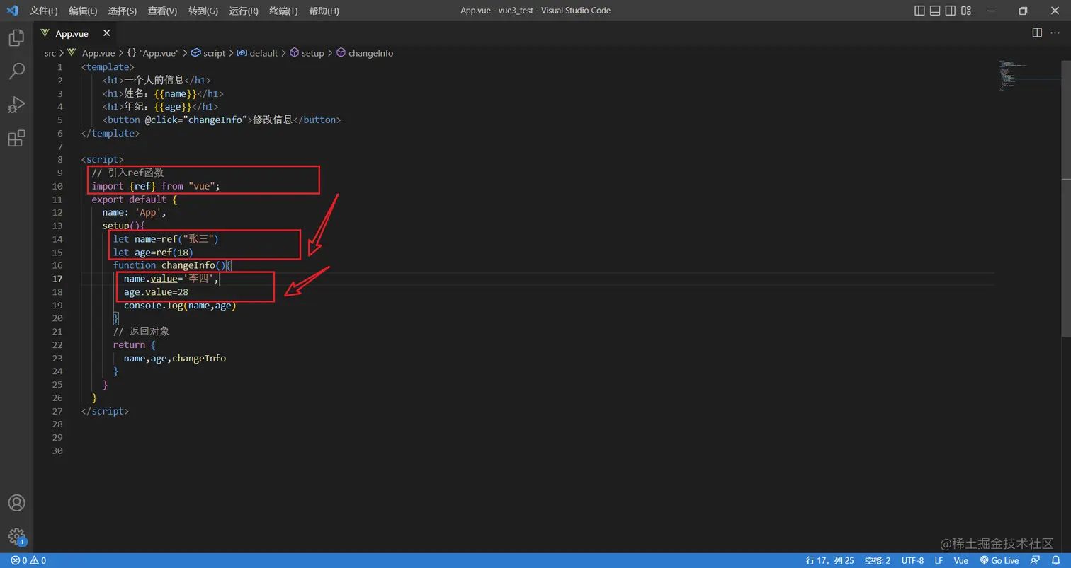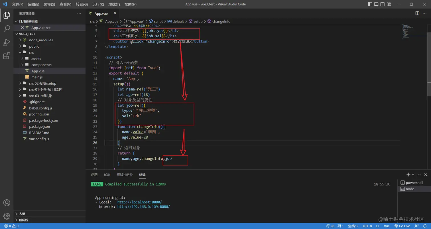 除了可以处理基本类型,ref也支持处理对象类型,接下来升级一下案例,演示使用ref处理对象类型