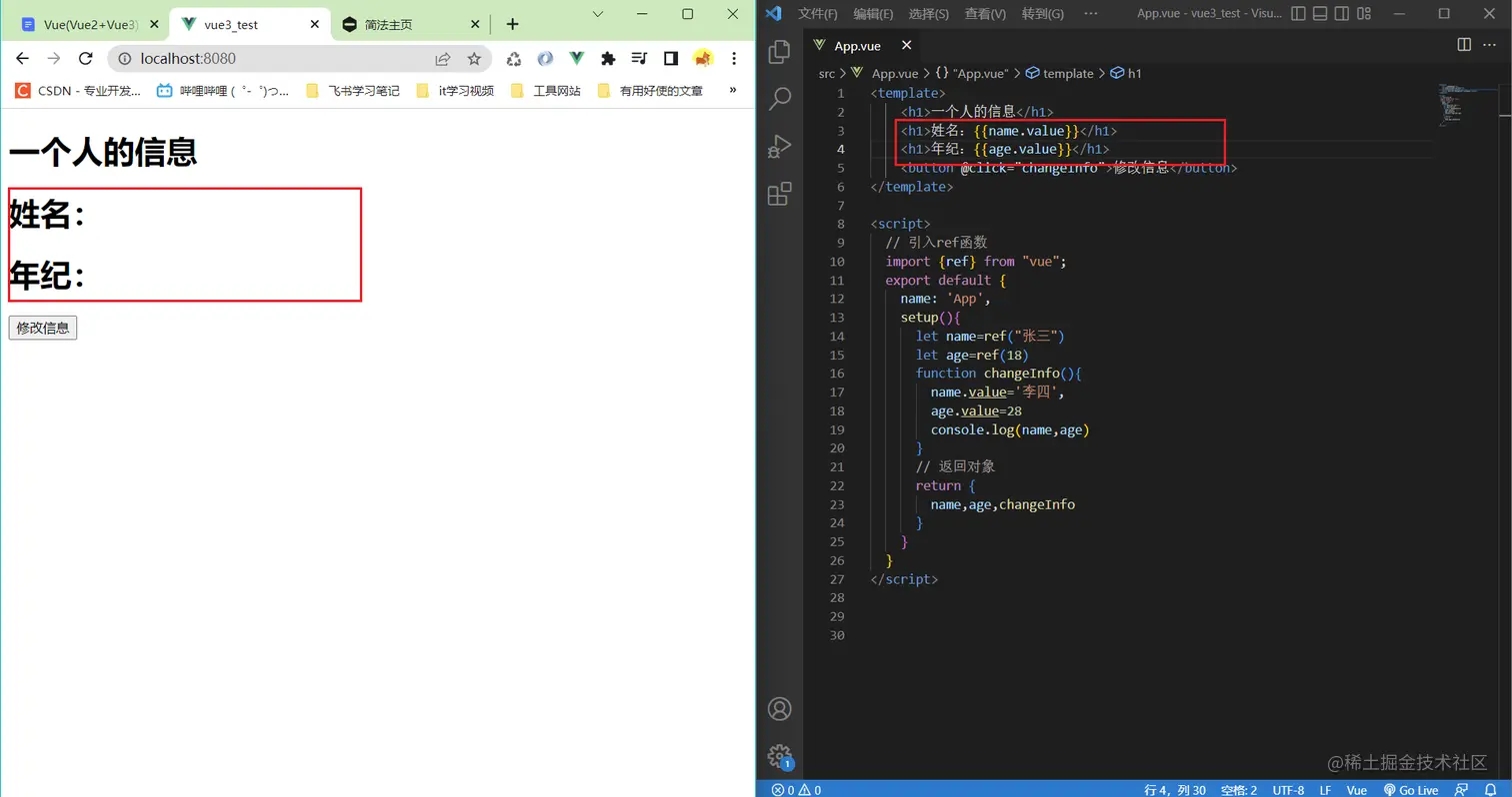 这是因为:在模板里面,不需要手动的.value的方式获取,vue3会自动帮助我们解析,如果发现是一个ref对象,就会自动帮我们获取.value属性