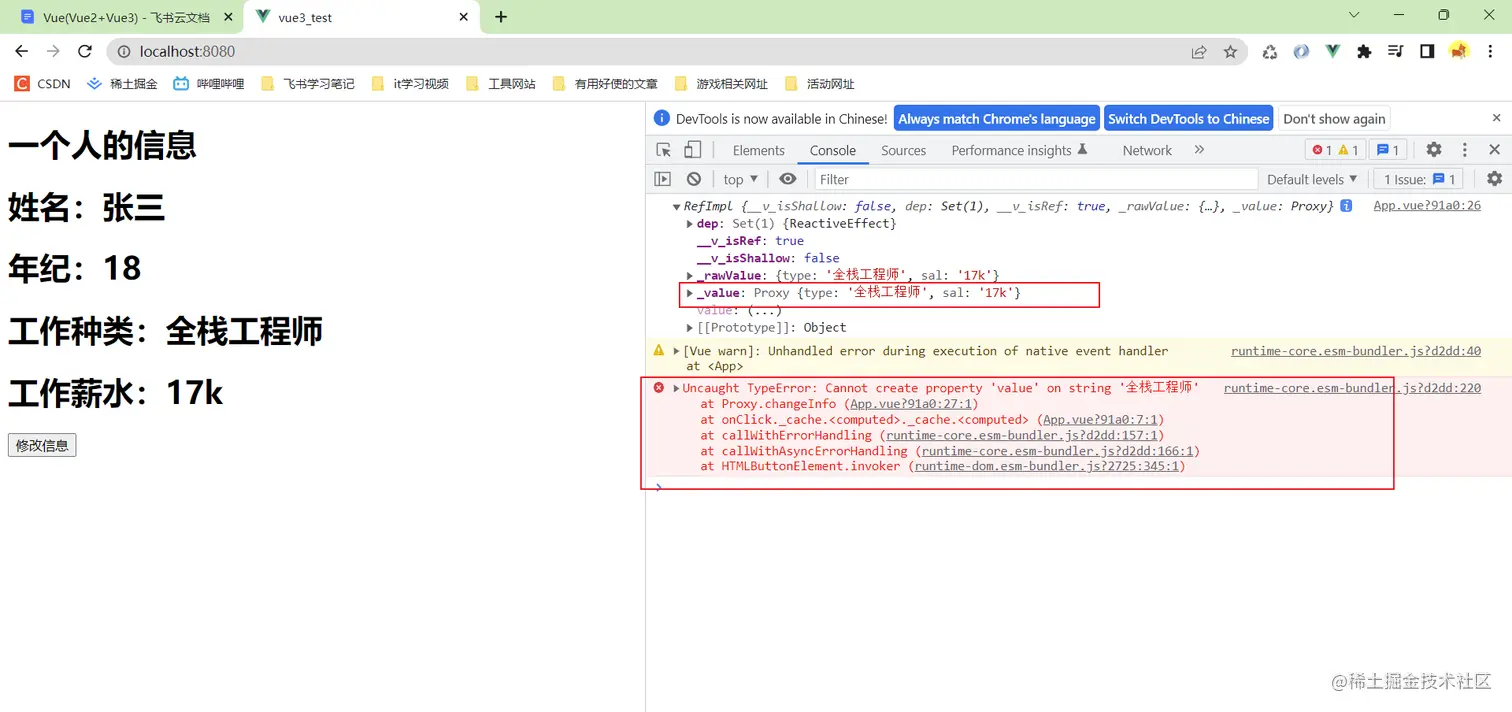 这是因为修改的方式不对,可以看到被ref修饰后的属性变成了一个refImpl对象