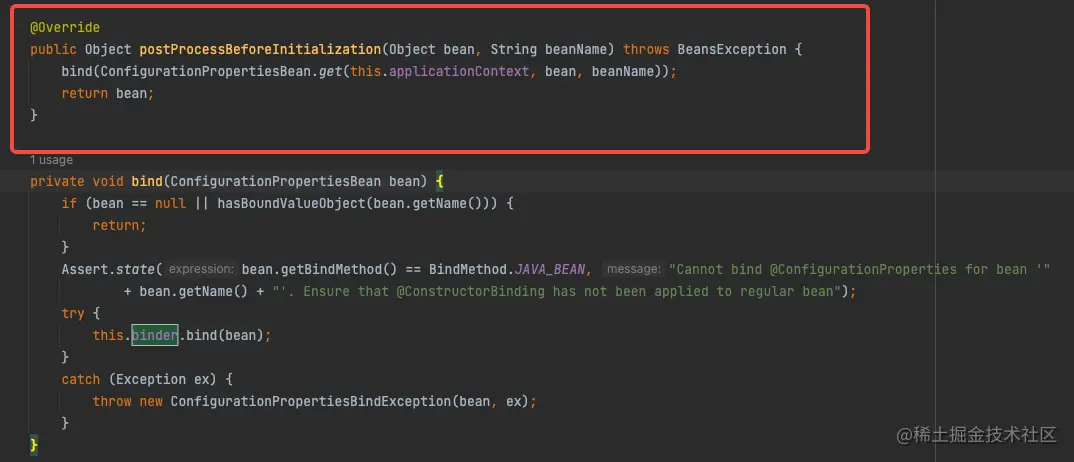 这就涉及到了 ConfigurationPropertiesBindingPostProcessor 类,它是 Bean后置处理器,负责扫描容器中所有被 @ConfigurationProperties 注解所标记的 Bean对象。如果找到了,则会使用 Binder 组件将外部属性的值绑定到它们身上,从而实现自动注入。