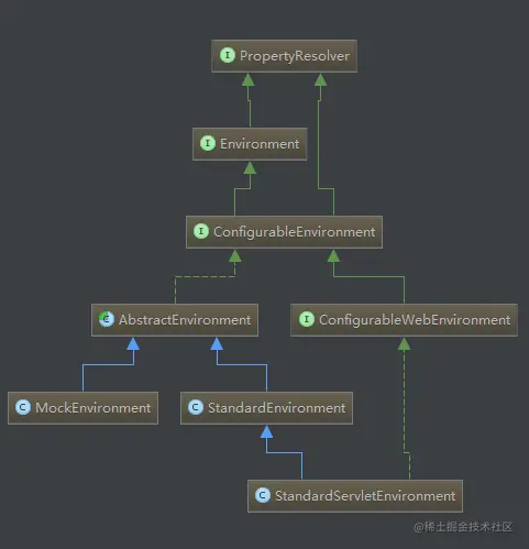 PropertyResolver是获取配置的关键类,其内部提供了操作PropertySource 队列的方法,核心方法getProperty(key)获取配置值,看了下这个类的依赖关系,发现 Environment 是它子类。