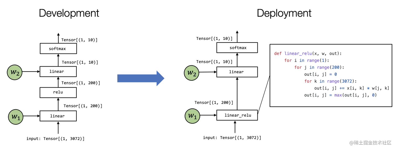 通常有多种方法可以在特定环境中实现模型执行。上图展示了一个例子。 值得注意的是,有两个区别: 首先,第一个 linear 层和 relu 计算被折叠成一个 linear_relu 函数;另外,这有一个特定的 linear_relu 的详细实现。当然,现实世界的用例,linear_relu 可以通过各种代码优化技术来实现。机器学习编译的过程就是将上图左侧的内容转换为右侧的过程。在不同的场景中,这个过程可以是手动完成的,也可以使用一些自动转换工具,或两者兼而有之。