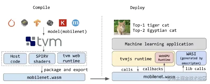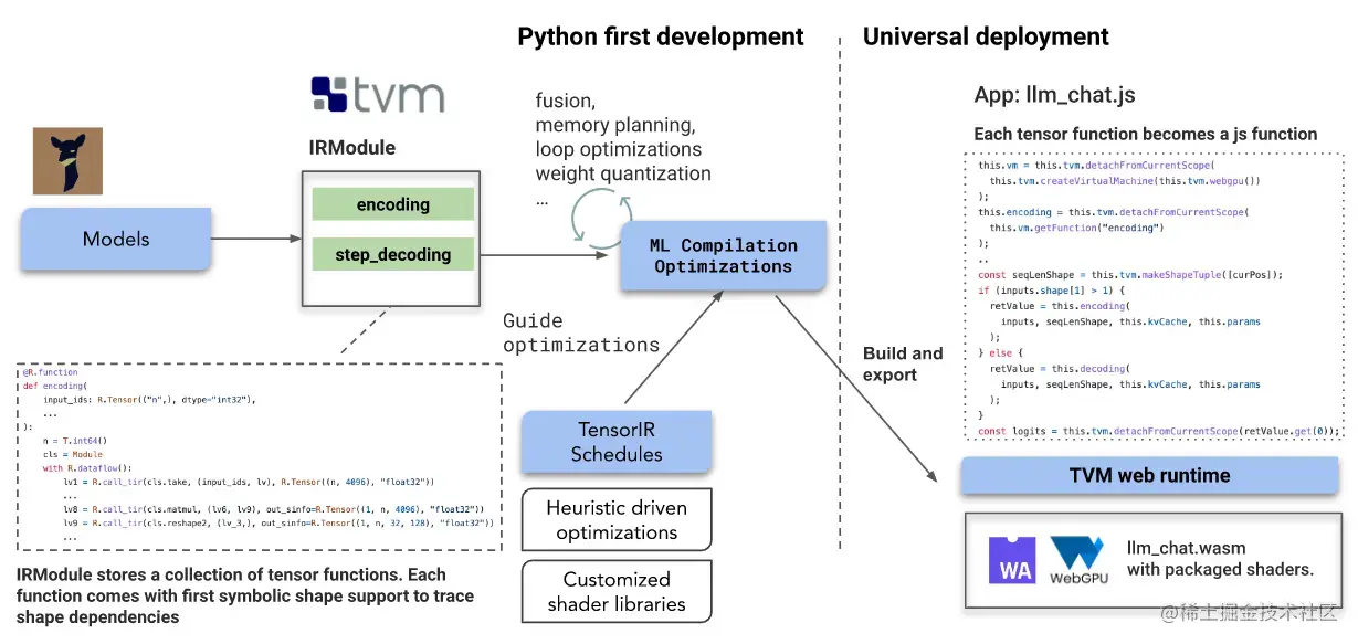 而 Web LLM,利用 TVM 将高级框架的模型,例如 Tensorflow,Keras,Pytorch,MXNET 和 ONNX,自动生成低级代码,在本案例中,以 SPIR-V 格式表示计算着色器。生成的低级代码可以被打包成一个部署模块。为了充分发布 WebGPU 的潜力,TVM 针对 WASM 和 WebGPU 做了专门的编译优化。