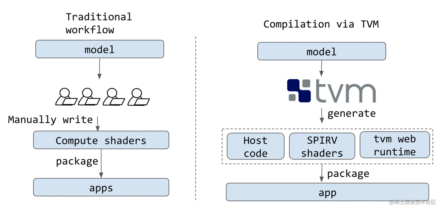 在实现原理上,web-llm 和 TensorFlow.js、ONNX.js 也有很大的差别。传统的方式需要通过手写着色器来实现各个算子,这一部分的实现细节,我之前分享过,可以参见《WebGL 为什么可以被用来做计算》。
