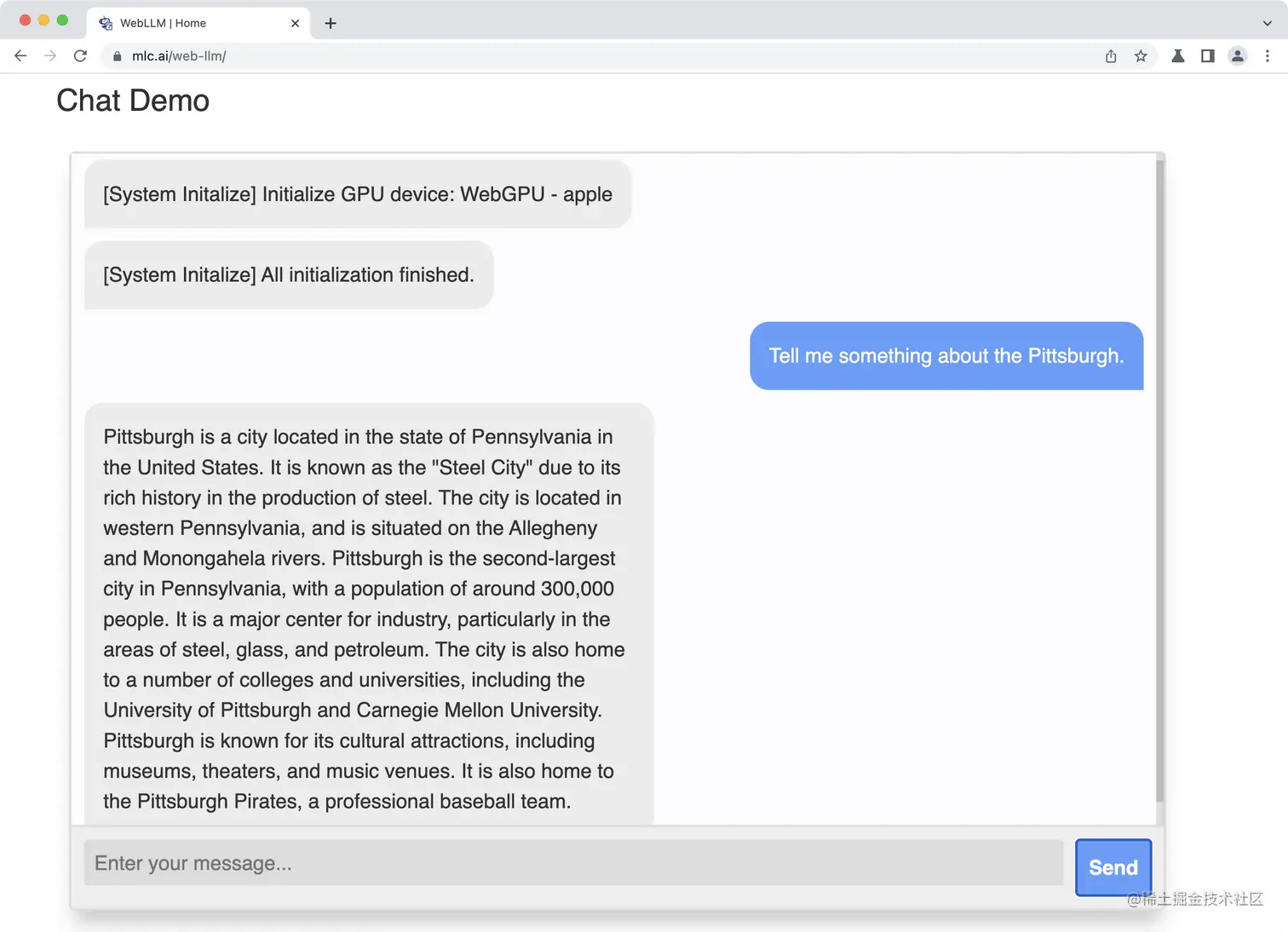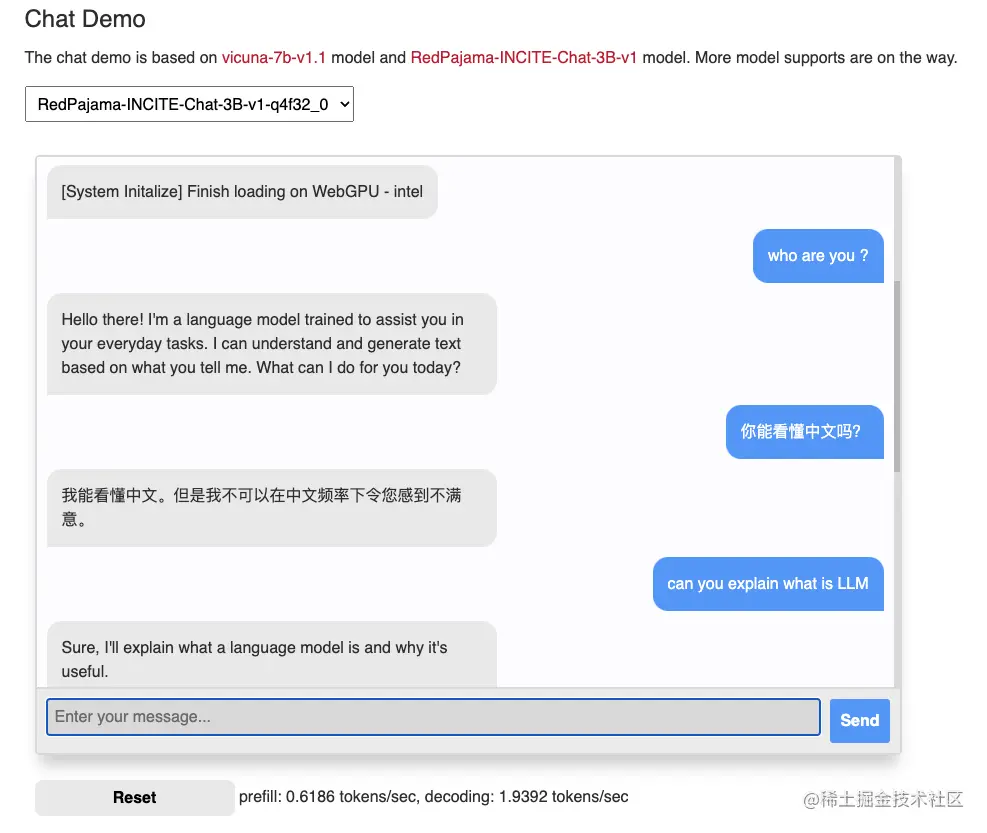 3.选择模型,输入问题,点击“send”。此时,应用就会获取模型参数,并缓存在本地,这个下载的过程耗时比较长,大概需要几分钟,不过只有第一次需要,这个过程很有可能会失败,多试几次。之后的问答相对快一些(但也需要几十秒,在我 intel 芯片的 mac 上运行并不是很快。)。
