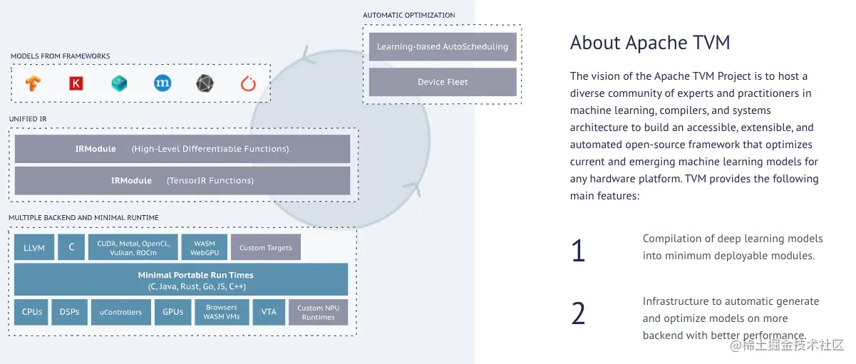 Apache TVM(Apache Tensor Virtual Machine) :是一个开源的深度学习编译器和运行时系统,可以将深度学习模型优化、编译和部署到各种硬件平台上。它支持多种深度学习框架,如TensorFlow、PyTorch、MXNet等,并且可以自动优化模型的计算图、内存分配和运算操作,从而提高模型的执行效率和性能。Apache TVM同时也支持多种硬件平台,包括CPU、GPU、FPGA、ASIC等,可以在不同的硬件平台上部署相同的深度学习模型。此外,Apache TVM还提供了一系列 API 和工具,方便用户进行模型调试、性能分析和部署。Apache TVM 已经成为深度学习编译器和运行时领域的重要开源项目之一,并且被广泛应用于工业界和学术界的深度学习应用中。
