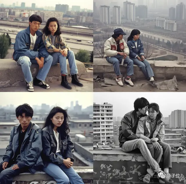 A pair of young Chinese lovers, wearing jackets and jeans, sitting on the roof, the background is Beijing in the 1990s, and the opposite building can be seen —v 5 —s 250 —q 2.
