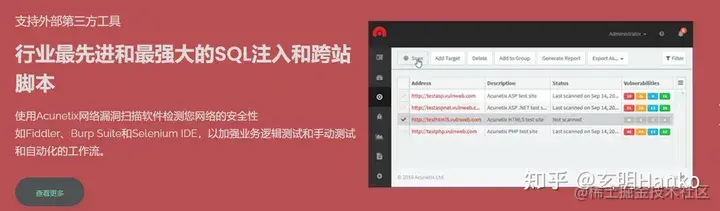 4)Acunetix:Acunetix是一款全面的Web应用程序安全测试工具,其中包含了SQL注入漏洞扫描功能。它能够检测并报告应用程序中的SQL注入漏洞,并提供详细的漏洞信息和建议修复措施。