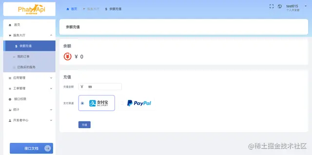 1、开发者端:作为前台开发者用户,可以便捷进行余额查看、在线充值和查看账单;