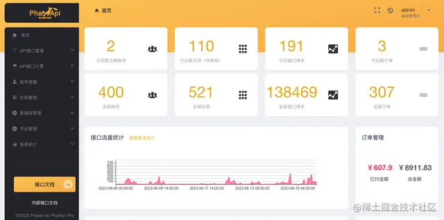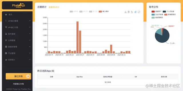 当然,在管理后台还需要能看到平台的整体运营情况,以及用户的充值收入。