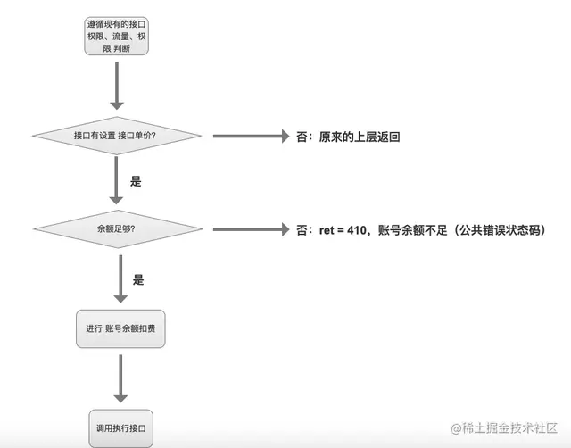 在核心的扣费逻辑上,针对API接口,可以组合使用:免费试用、接口套餐、钱包余额扣费 多个计费方式。可以参考以下计费逻辑流程图:
