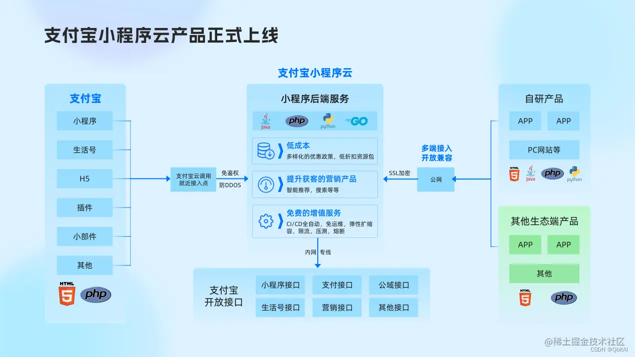 作为一站式云产品,支付宝小程序云旨在帮助商家、服务商和开发者降低成本、提高效率、增加获客转化率。如果你想新开发一个支付宝小程序,支付宝小程序云可以帮你快速搭建;如果你已经有了一个支付宝小程序,想升级“装修”,支付宝小程序云也可以帮你一键托管;如果你的支付宝小程序想参加大促、秒杀或者抢券这种可能导致人流量极速爆发的活动,也不用担心,支付宝小程序云可以为你配置峰值流量压测、限流套件,确保你的产品稳定运行,而且支持按量计费,用多少收多少,不用就不收了,绝不让你浪费一分钱。