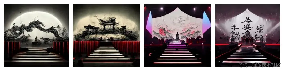 | 舞台设计(第一版)效果:太过传统 | AI绘画:中国风、舞台设计、水墨质感等 |