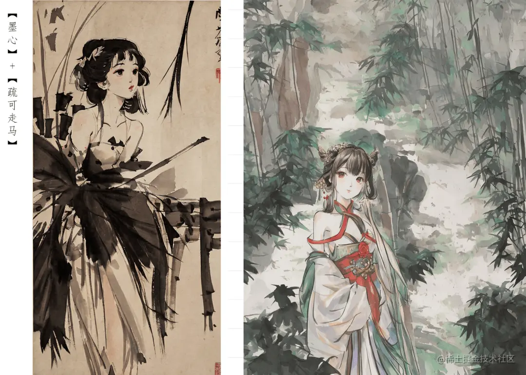 训练“墨心”模型:209张明清两代著名水墨画,prompt描述内容(花、鸟、鱼、竹子等)、构图、技法