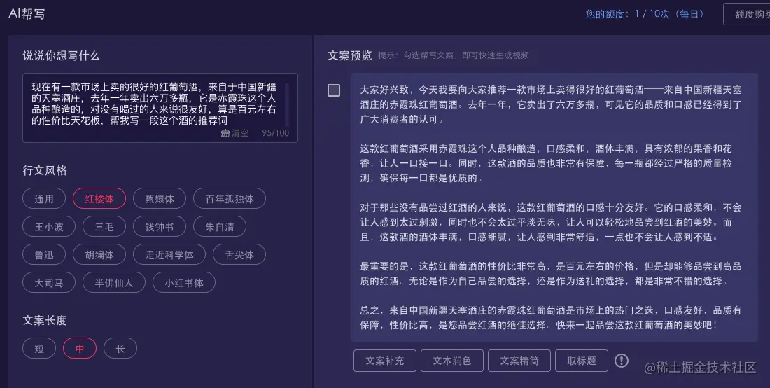 文案配视频:视频不算精致,在画面内容和文案内容的匹配度上有所欠缺,国外素材比例更重;但通过“一键生成”流程,能够替代中低层次的创作内容,适合科普和美食类配文。