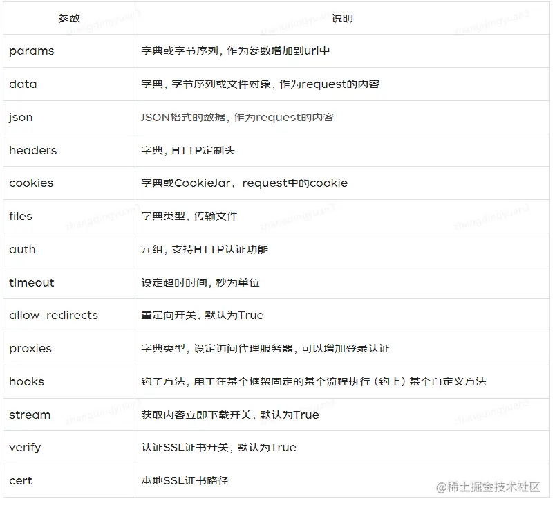 常用的参数有:params、data、json、headers、cookies,其他参数讲解与示例将在(二)中进行介绍。