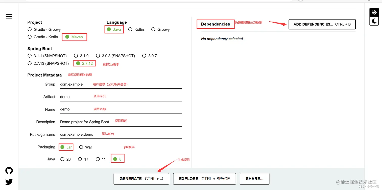 不使用 Idea 也可以创建 Spring Boot 项⽬,我们可以使用 Spring 官方提供的网页版来创建 Spring Boot 项目。还在但你实在创建不了的时候,可以通过网页去创建Spring Boot项目。