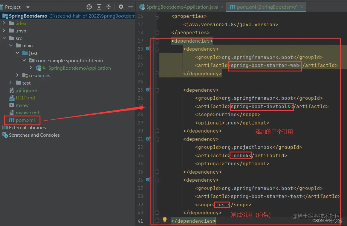 点击 Finish 就完成 Spring Boot 的项目创建了,在pom.xml就可以看见我们添加的依赖。