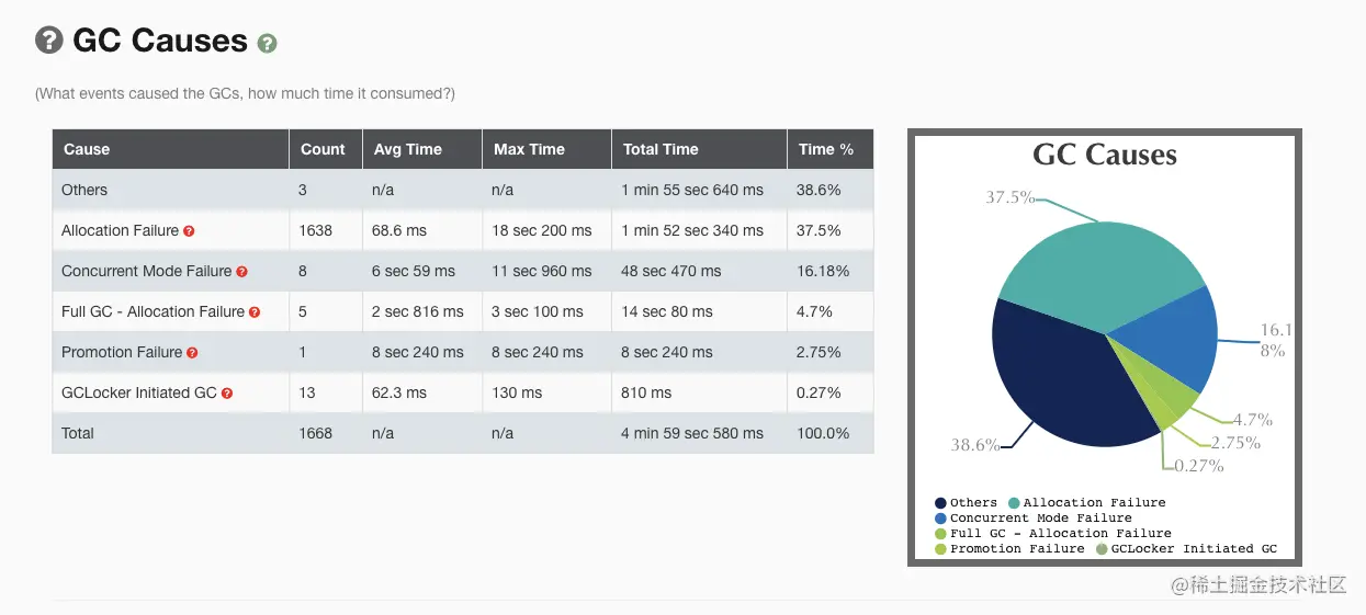拿到 GC 日志,我们就可以简单分析 GC 情况了,通过一些工具,我们可以比较直观地看到 Cause 的分布情况,如下图就是使用 gceasy 绘制的图表: