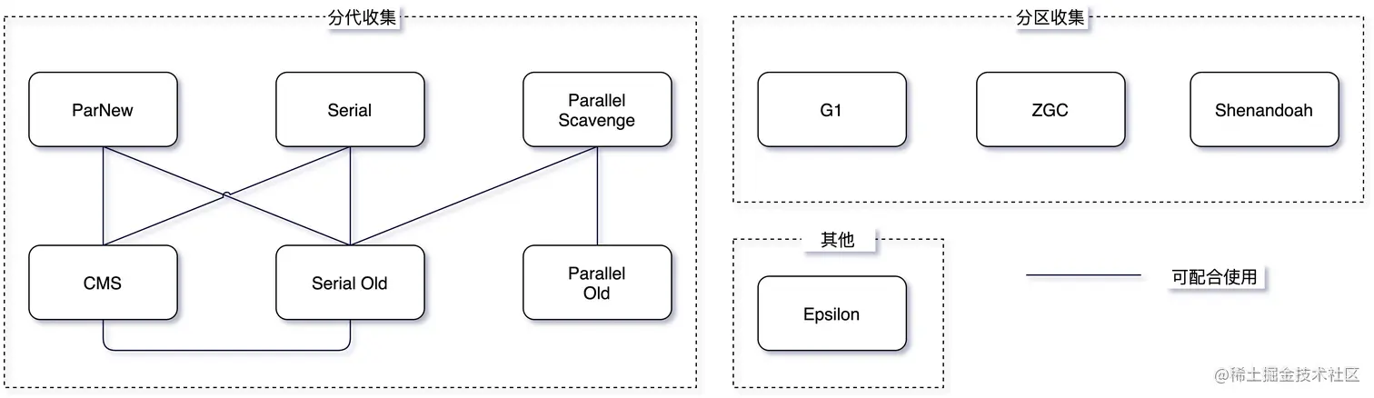 以上仅列出常见收集器,除此之外还有很多,如 Metronome、Stopless、Staccato、Chicken、Clover 等实时回收器,Sapphire、Compressor、Pauseless 等并发复制/整理回收器,Doligez-Leroy-Conthier 等标记整理回收器,由于篇幅原因,不在此一一介绍。