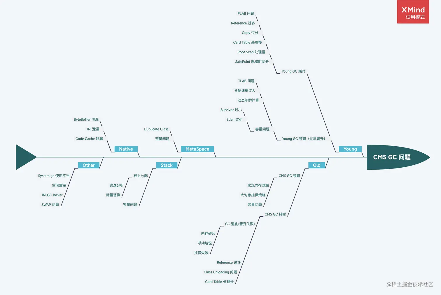 送上一张问题根因鱼骨图,一般情况下我们在处理一个 GC 问题时,只要能定位到问题的“病灶”,有的放矢,其实就相当于解决了 80%,如果在某些场景下不太好定位,大家可以借助这种根因分析图通过排除法去定位。
