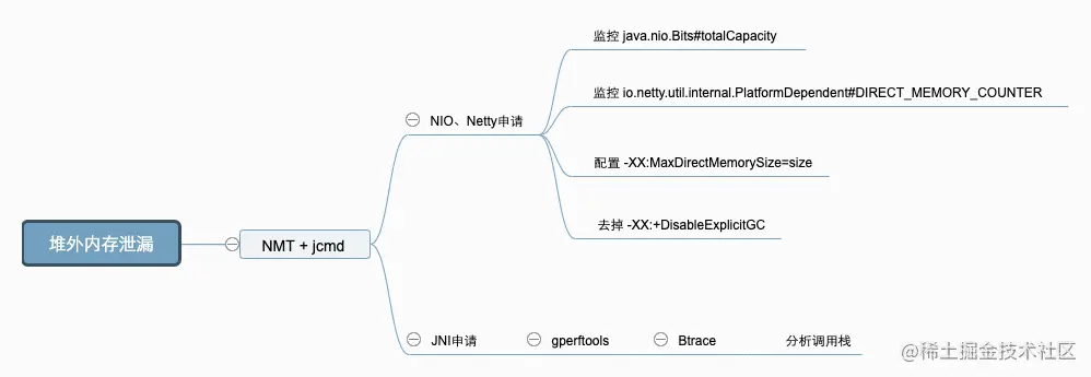 UnSafe#allocateMemory,ByteBuffer#allocateDirect主动申请了堆外内存而没有释放,常见于 NIO、Netty 等相关组件。 - 代码中有通过 JNI 调用 Native Code 申请的内存没有释放。