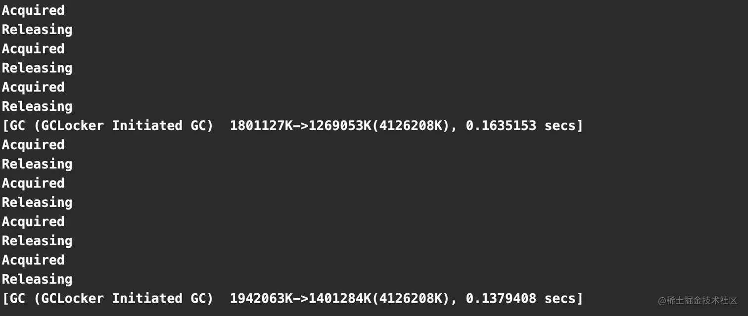 运行该 JNI 程序,可以看到发生的 GC 都是 GCLocker Initiated GC,并且注意在 “Acquired” 和 “Released” 时不可能发生 GC。