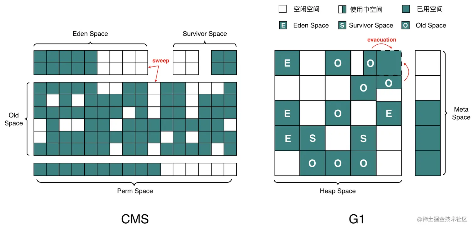 目前使用最多的是 CMS 和 G1 收集器,二者都有分代的概念,主要内存结构如下: