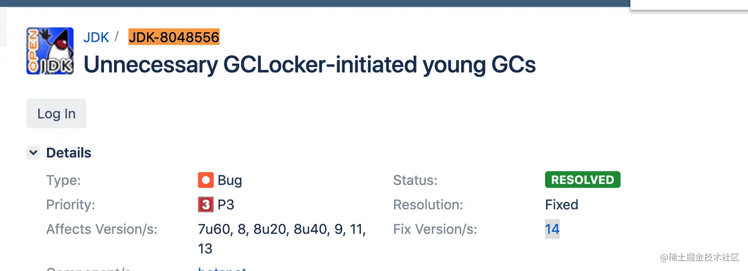 - 可能触发额外不必要的 Young GC,JDK 有一个 Bug,有一定的几率,本来只该触发一次 GCLocker Initiated GC 的 Young GC,实际发生了一次 Allocation Failure GC 又紧接着一次 GCLocker Initiated GC。是因为 GCLocker Initiated GC 的属性被设为 full,导致两次 GC 不能收敛。