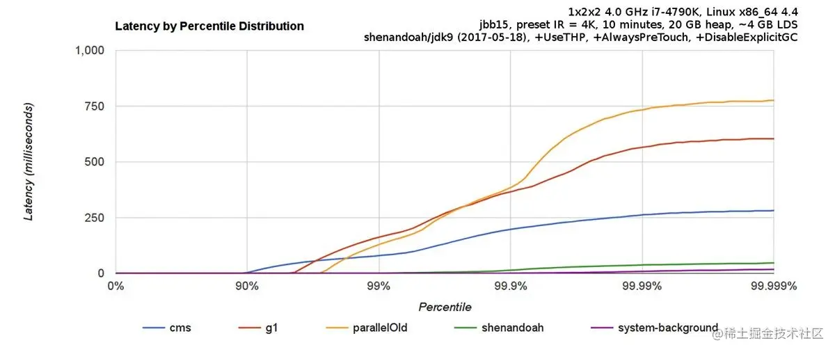- Shenandoah: 由 Red Hat 的一个团队负责开发,与 G1 类似,基于 Region 设计的垃圾收集器,但不需要 Remember Set 或者 Card Table 来记录跨 Region 引用,停顿时间和堆的大小没有任何关系。停顿时间与 ZGC 接近,下图为与 CMS 和 G1 等收集器的 benchmark。