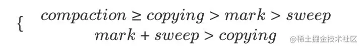 把 mark、sweep、compaction、copying 这几种动作的耗时放在一起看,大致有这样的关系: