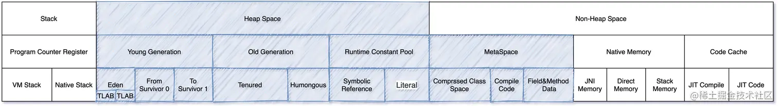 从 JCP(Java Community Process)的官网中可以看到,目前 Java 版本最新已经到了 Java 16,未来的 Java 17 以及现在的 Java 11 和 Java 8 是 LTS 版本,JVM 规范也在随着迭代在变更,由于本文主要讨论 CMS,此处还是放 Java 8 的内存结构。