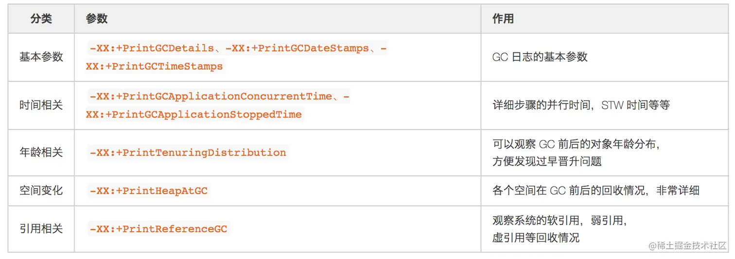 - GC 参数: 如果堆、栈确实无法第一时间保留,一定要保留 GC 日志,这样我们最起码可以看到 GC Cause,有一个大概的排查方向。关于 GC 日志相关参数,最基本的