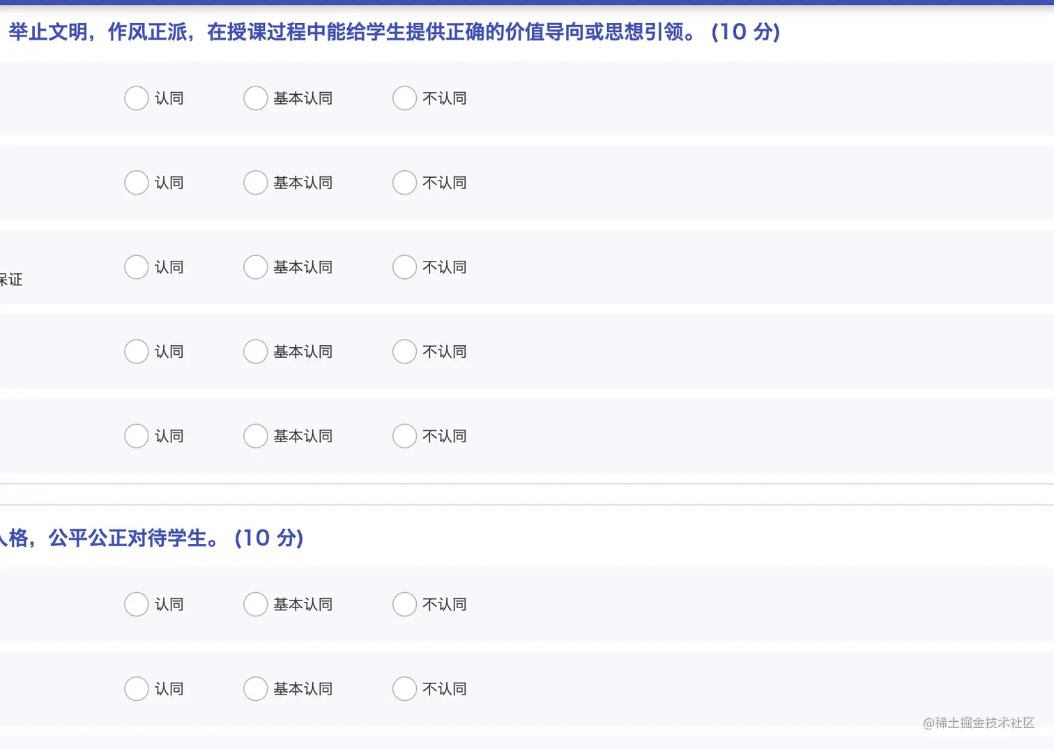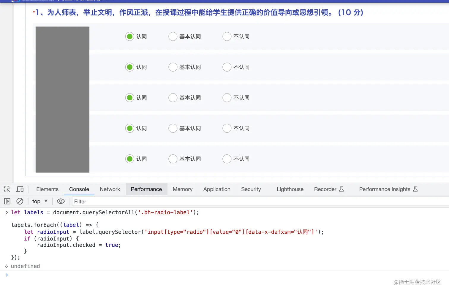 这段代码首先通过 querySelectorAll 选择所有 class 为 'bh-radio-label' 的 label。然后,使用 forEach 循环每个 label,再用 querySelector 在每个 label 下查找 value 为 '0' 且 data-x-dafxsm 属性为 '认同' 的 radio input。如果找到,就将其 checked 属性设为 true,以此来全选。