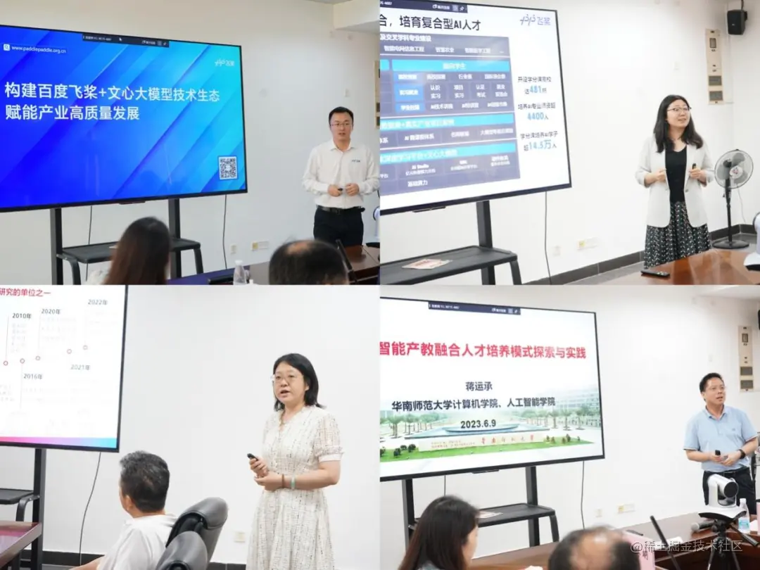 深度学习和大模型作为 AI 前沿技术和基础设施,迎来发展黄金期,百度将自主研发的产业级深度学习平台飞桨开源开放,为高校学习前沿技术、产业实现智能化升级提供了基础技术支撑。百度 AI 技术生态华南区负责人曾旭东以《百度飞桨和文心大模型的技术生态与产业化应用》为题作报告,百度 AI 技术生态教育运营负责人钱芳以《百度飞桨产教融合共育 AI 人才》为题,进行相关分享。高校分享环节中,华南理工大学计算机科学与工程学院副院长高英介绍了华南理工大学计算机科学与工程学院的教学实践体系建设,华南师范大学人工智能学院计算机学院院长蒋运承介绍了华南师范大学人工智能产教融合人才培养方式,分享在 AI 领域所做研究或教学工作中的经验、遇到的难点和面临的痛点。