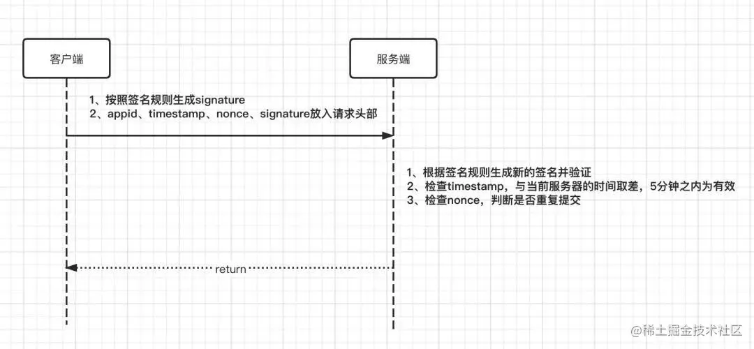 接口签名,顾名思义,就是通过一些签名规则对参数进行签名,然后把签名的信息放入请求头部,服务端收到客户端请求之后,同样的只需要按照已定的规则生产对应的签名串与客户端的签名信息进行对比,如果一致,就进入业务处理流程;如果不通过,就提示签名验证失败。