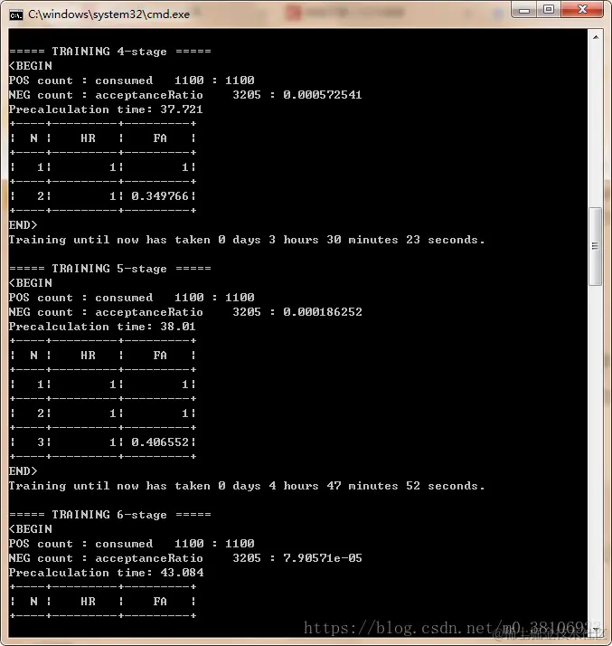 opencv_traincascade.exe -data xml -vec pos.vec -bg neg.txt -numPos 1100 -numNeg 3205 -numStages 15 -w 40 -h 40 -minHitRate 0.999 -maxFalseAlarmRate 0.5 -mode ALL