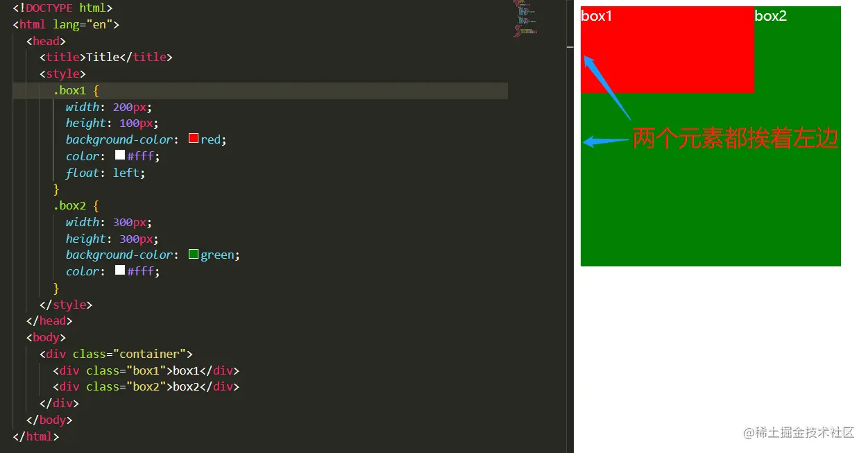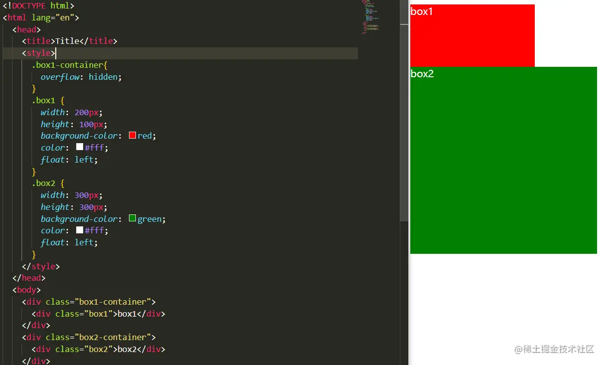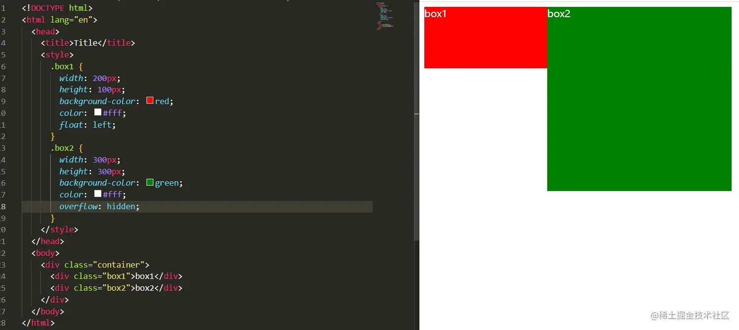 第四条,BFC区域不会与float重叠。在第三条代码的基础上,我们将box2,设置成overflow:hidden,使他形成一个新的BFC。