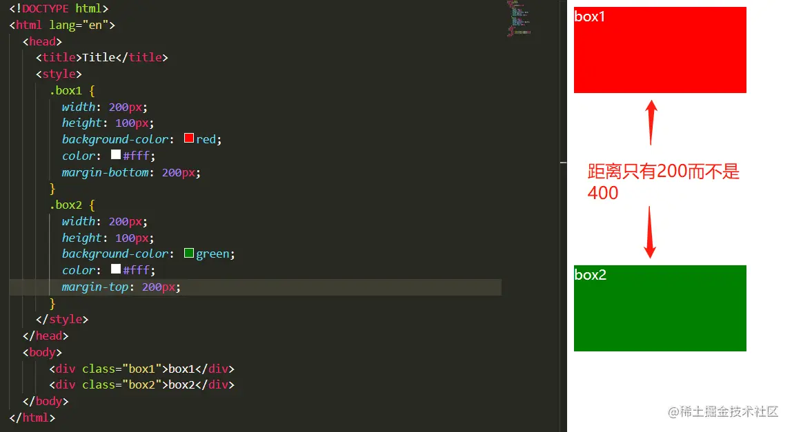 盒子垂直方向上的距离由margin决定。属于同一个BFC的两个相邻的Box的margin会发生重叠。