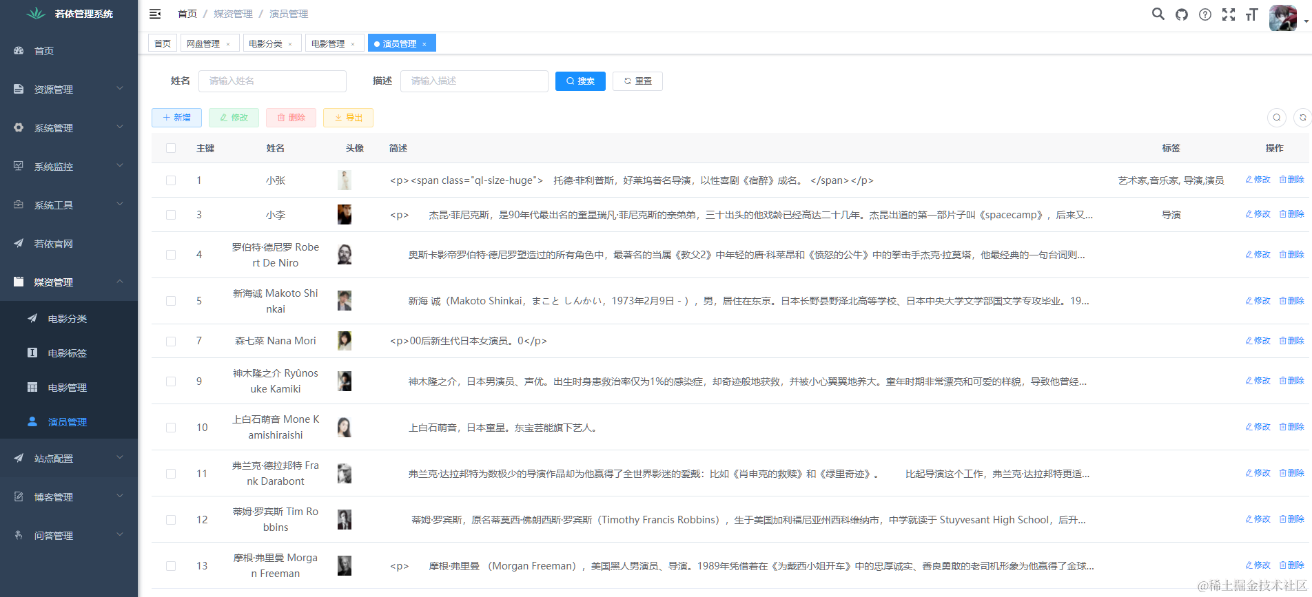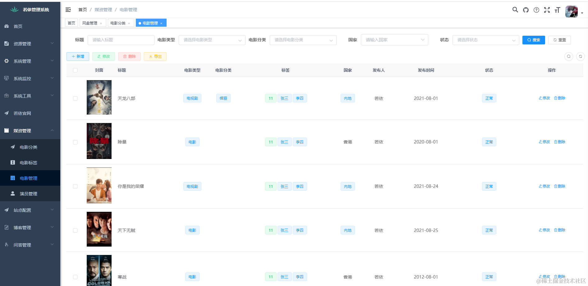 - 后台管理系统模块增加了资源管理模块、媒资管理模块、站点配置模块、博客模块、问答模块;