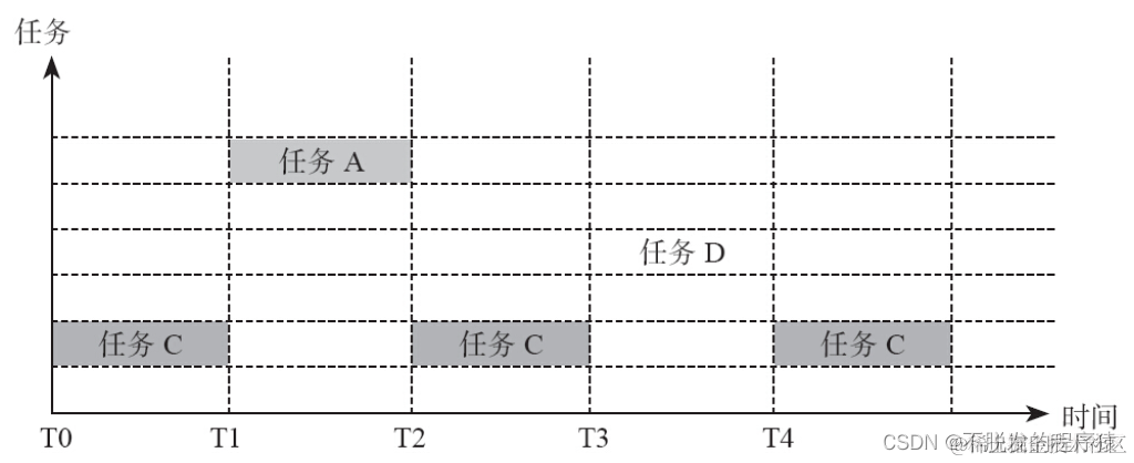 - T1时刻,任务A就绪,由于任务A优先级高于任务C,所以它抢占了任务C,任务A被调度执行;