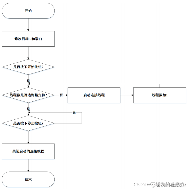 DOS 攻击是对目标 IP 的特定端口采用指定的线程数去发送大量的数据和连接请求,不断的消耗目标主机的资源,从而造成目标主机连接资源耗尽,导致其它主机无法使用这些连接资源。其流程图如下图 所示: